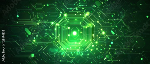 Abstract Green Circuit Board Technology Background with Glowing Lines and Nodes