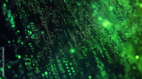 Abstract green digital data stream with glowing particles background