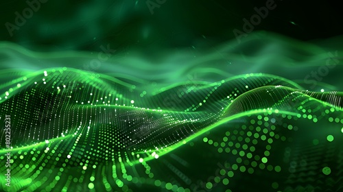 Abstract green particle background. Flow wave with dot landscape. Digital data structure. Future mesh or sound grid. Pattern point visualization. Technology vector illustration.