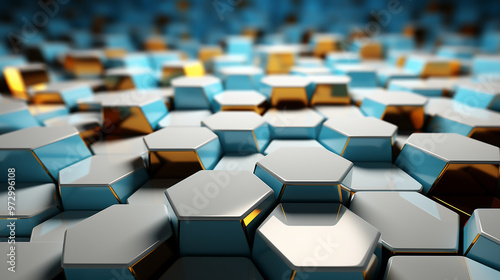 Abstract hexagonal grid pattern with overlapping and interlocking shapes, creating a dynamic and visually
