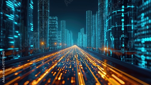 abstract highway path through digital binary towers in city