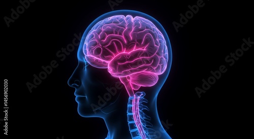 Abstract Human Head Profile with Pink Brain and Blue Outline in Digital Rendering on Black Background Perfect for Scientific Conceptual Art