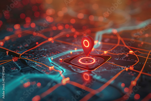 Abstract image of a digital map with a glowing red location marker in the center, representing navigation and GPS technology.