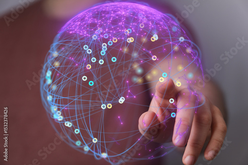 Abstract image of a hand interacting with a glowing network sphere, representing global connectivity and data.