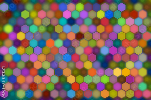 Abstract image of blured honeycomb grid tiled with random colorful color for background with black border.