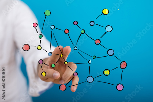 Abstract image of hand interacting with colorful network nodes and lines. Represents connection, communication, and networking.