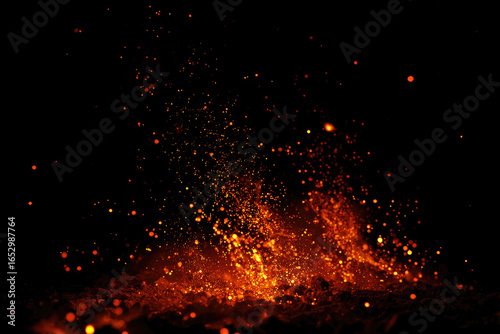 Abstract isolated fiery glowing particles on a black background fly up. Fire sparks on a dark background. Fire Animation. Raging Campfire Flames. Flying Embers from fire