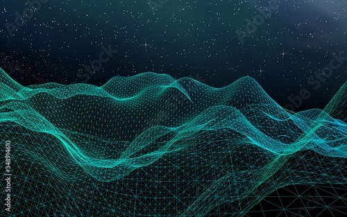 Abstract landscape on a dark background. Cyberspace grid. hi tech network. Outer space. Starry outer space texture. 3D illustration