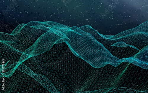 Abstract landscape on a dark background. Cyberspace grid. hi tech network. Outer space. Starry outer space texture. 3D illustration
