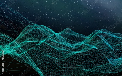 Abstract landscape on a dark background. Cyberspace grid. Hi-tech network. Outer space. Starry outer space texture. 3D illustration