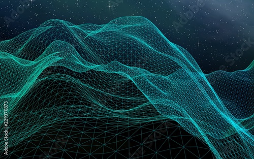 Abstract landscape on a dark background. Cyberspace grid. Hi-tech network. Outer space. Starry outer space texture. 3D illustration