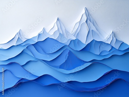 Abstract layered paper mountains and ocean waves.