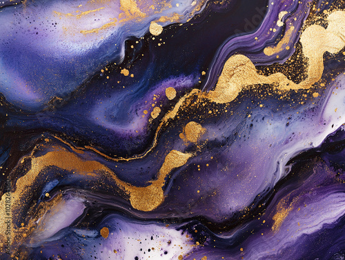 Abstract luxury marble fluid art painting in dark blue, purple, and gold