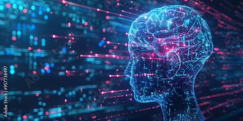 Abstract machine learning concept with AI technology and digital data flow on futuristic background