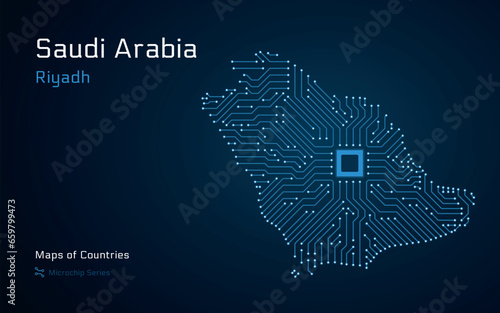 Abstract map of Saudi Arabia with Microchip pattern. Riyadh Capital.