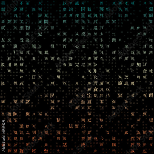 Abstract Matrix background. Random Characters of Chinese Traditional Alphabet. Gradient matrix pattern. Blue and orange color theme backgrounds. Tileable horizontally. Classy vector illustration.