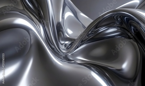 Abstract metallic silver liquid, flowing, swirling, shiny, reflective, smooth, elegant.