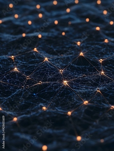 Abstract network connection; glowing nodes and lines. Digital network visualization.
