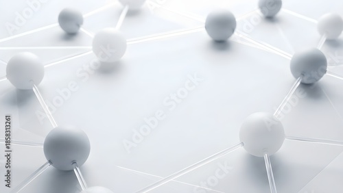 Abstract network connection nodes on white background, molecular structure concept, clean minimalist technology, 3d rendering