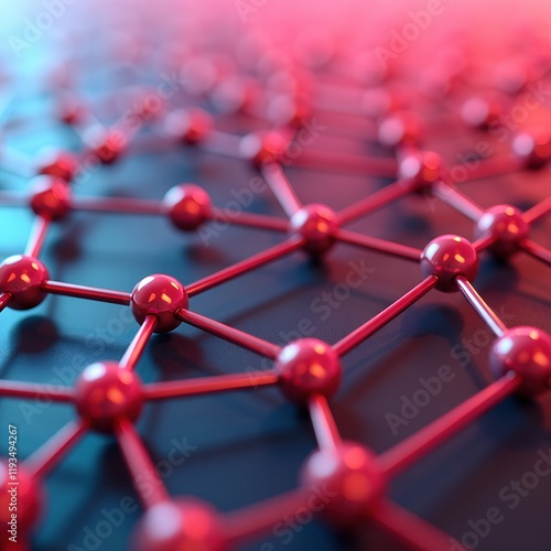 Abstract network connection. Red spheres and rods form a complex grid pattern, representing interconnectedness and global communication.