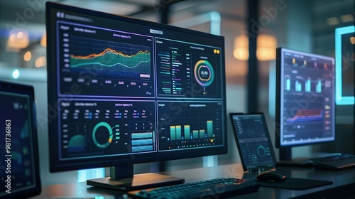 Abstract Network Monitoring Dashboard on Computer Monitor: Featuring Real-Time Data Analytics, Graphs, and System Health Indicators