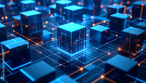 Abstract network of connected glowing cubes represents technology and data