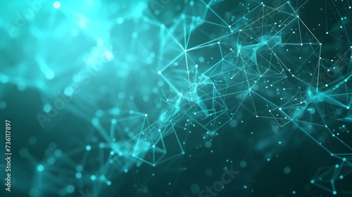 Abstract network structure, connected dots, network connections, cyan and white colored lines, and dots form a 3D Polygon, suitable for information, and technology-themed backgrounds. AI Generated.