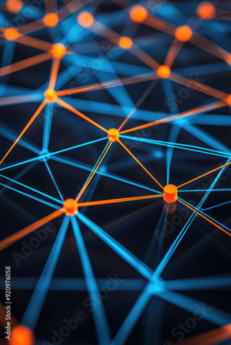 Abstract network visualization with blue and orange nodes connected by lines, representing digital connections, technology, and data exchange.
