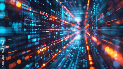 Abstract numerical background, including binary code and artificial intelligence algorithms. A futuristic scene with abstract visual representation of flowing code and advanced technology.