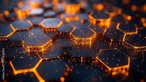 Abstract Orange and Black Hexagonal Pattern With Glowing Elements Creating a Dynamic and Visually Striking Background