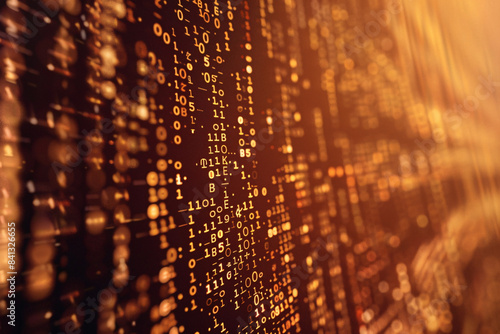 Abstract orange digital data stream with binary code and bokeh effect in the background