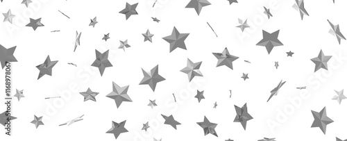 Abstract pattern of random falling silver stars on white background.