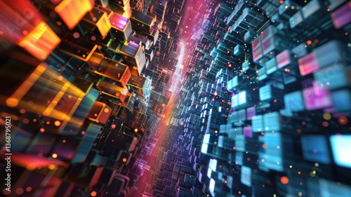 Abstract picture micro particle in geometric shape represent data flow. Vivid flowing object with high tech texture, create digital effect scene perfect for energetic, fantasy wallpaper design. AIG53.