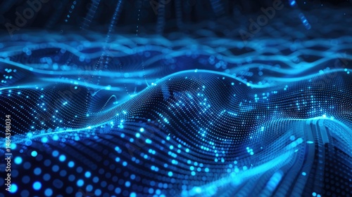 Abstract picture of blue light particle with digital technology style design connecting become dynamic of electric wave movement represent about flowing of data or structure of network system. AIG53.