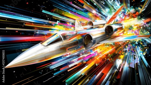 Abstract pixel art of a supersonic jet breaking the sound barrier, surrounded by a vibrant explosion of multicolored light streaks on a black background.