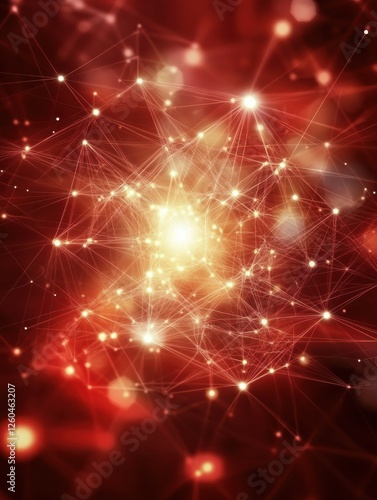 Abstract red background with connecting dots and lines. Network, technology, science, and communication concept.