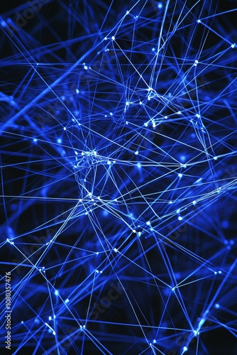 Abstract representation of a complex network of interconnected blue lines and points depicting technology, digital communication, and modern scientific advancements in a dark environment
