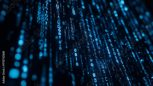 Abstract representation of data flows in a digital environment with blue binary code effects
