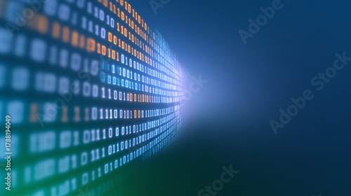 Abstract representation of digital data flow with binary code and gradient colors, illustrating technology and innovation concepts.