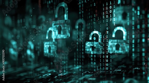Abstract representation of digital security with locks and binary code, symbolizing data protection and encryption technology.