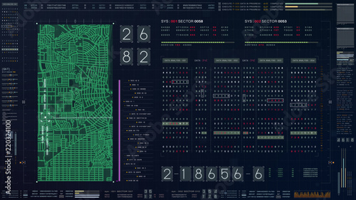 Abstract running numbers code hacking source code and map digital data holographic city buildings and information technology animation for head up display and user interface background