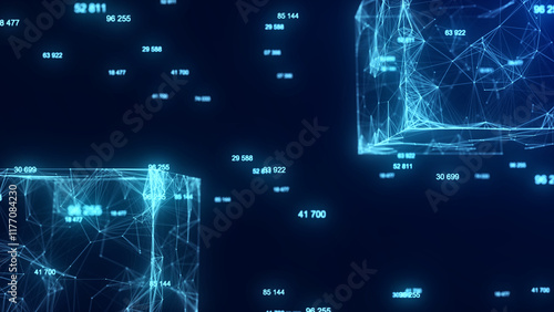 Abstract sci-fi cubes with particle and line with digital indicators. Technology network connection on world. Global digital connections ai. Big data flow. Blockchain encryption. 3D rendering.