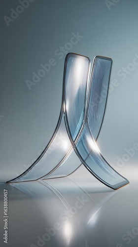 Abstract sculpture made of clear blue glass with swirling patterns and light reflections against a soft gradient background