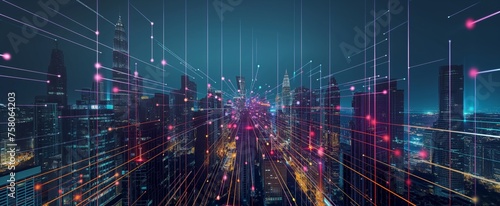 Abstract smart city. Data points and network lines illuminate nighttime urban landscape, emphasizing connectivity and data analysis.