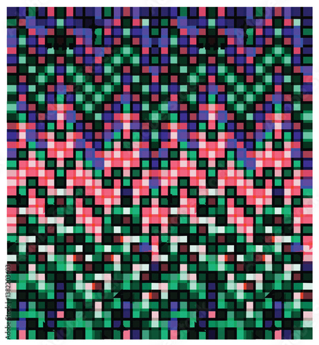 Abstract square print pixelated pattern with vibrant colors, resembling a digital mosaic, The bold colors and geometric shapes give the pattern a modern and stylish feel.