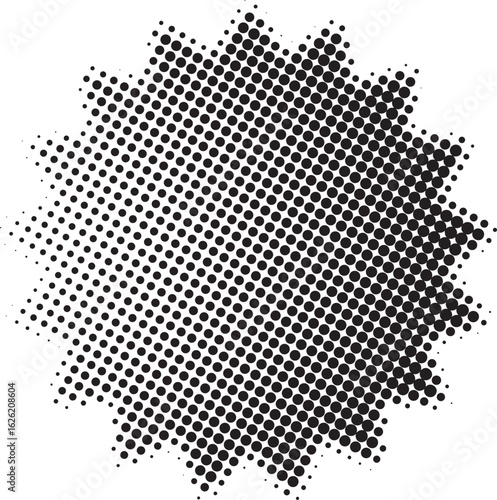 Abstract starburst shape created with a halftone dot pattern on a white background