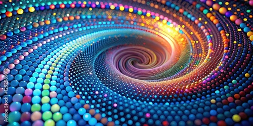 Abstract swirling vortex of vibrant multicolored spheres, a mesmerizing digital artwork depicting a dynamic energy flow in a kaleidoscopic pattern of bright hues.