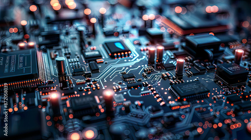 Abstract tech background made of printed circuit board depth of field effect bokeh internet connections cloud computing neural network big data intricate design