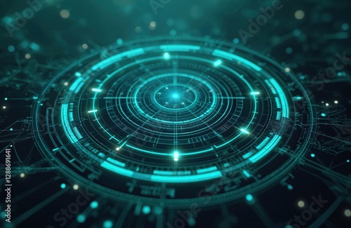 Abstract tech background with radar pattern in blue, teal colors. Futuristic design features glowing circles, radial lines, geometric shapes. Digital sonar wallpaper for modern technology projects,