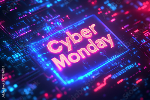 Abstract tech dark background with glowing binary code and neon accents, featuring bold "CYBER MONDAY" text in the center.